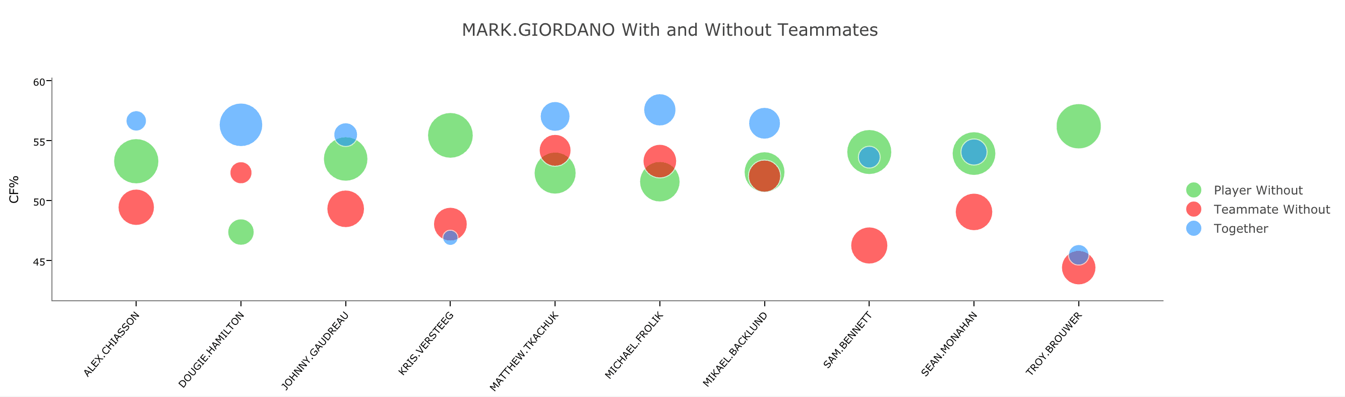 Did Giordano make his teammates better, or were they worse with him on the ice? Corsica’s WOWY tool takes his 10 more common teammates, and gives us a snapshot of his impact with them: