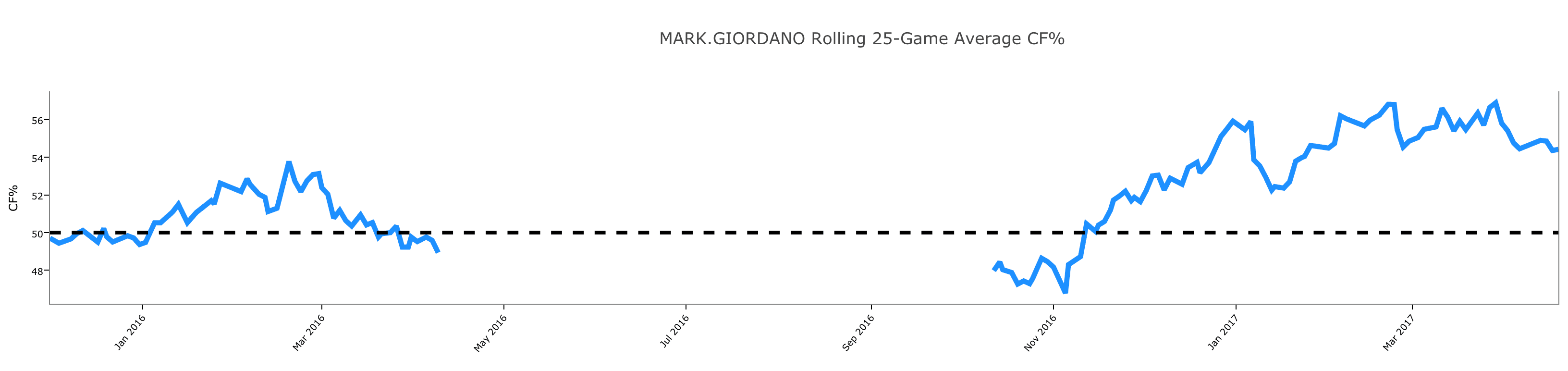 As far as defence partners go, he spent the strong majority of his season with Hamilton, and it paid off. The two boosted one another’s play quite a bit, though it appears Giordano was helped more by Hamilton’s presence than vice versa.