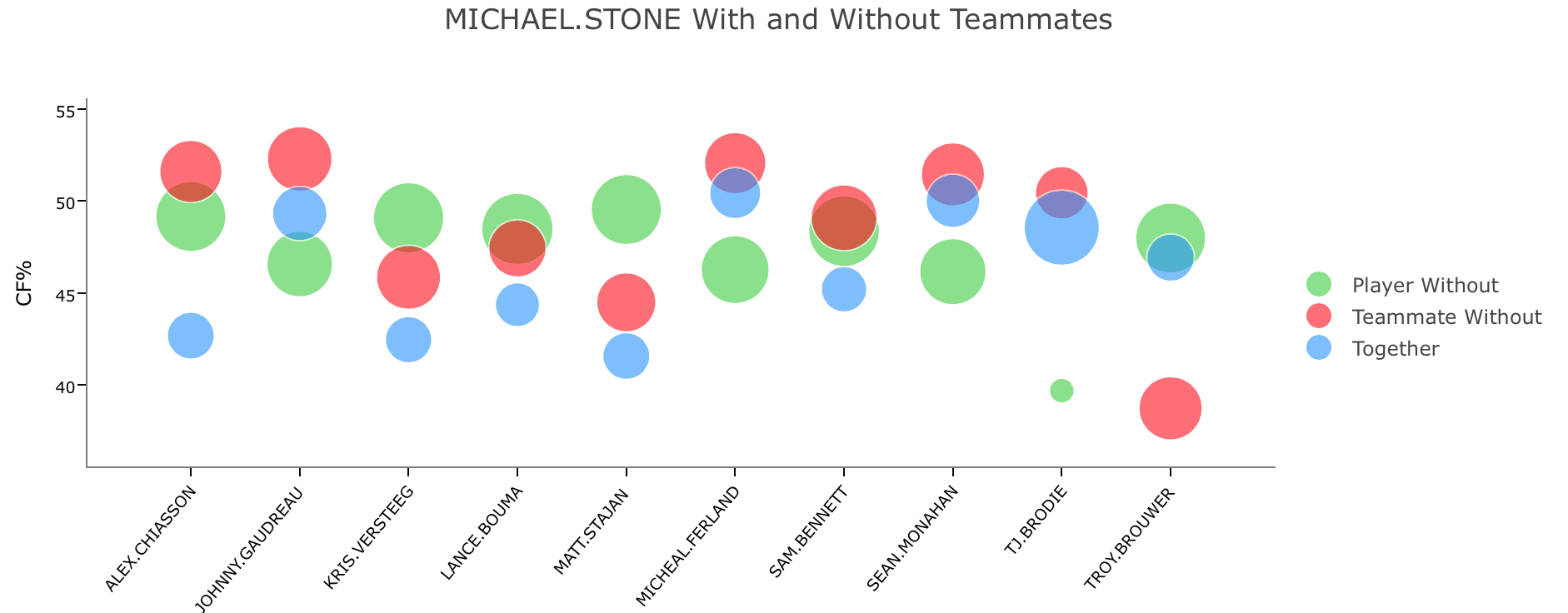 Stone has some weird results. He paired well with T.J. Brodie, although Brodie was the one doing most of the heavy lifting. He held up well with the 13-23-79 line, but was not great away from them. For whatever reason (likely related to the player on the far right of this chart), Stone just did not gel well with the third line.