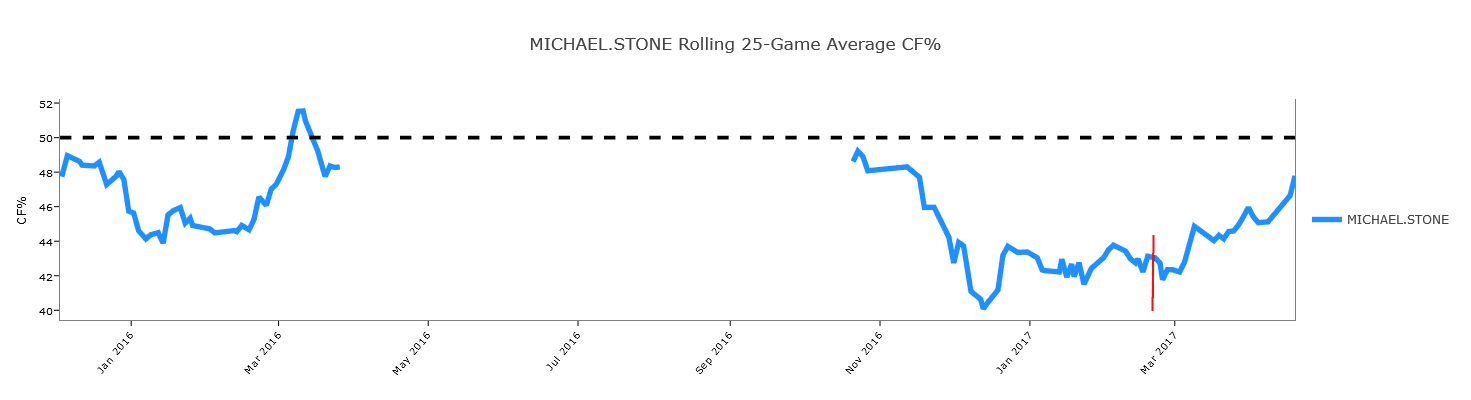 The chart is a bit unfair to Stone. With a 25-game rolling average, his raw CF% from Arizona still haunts him. I added the red line to mark when he joined the Flames, and his CF% improves steadily, almost reaching the levels he was playing at the season prior. That could be an indication of the Flames being better, that could be an indication that he somehow became better. It could be both. All we know is that his raw CF% improved when he came to Calgary.