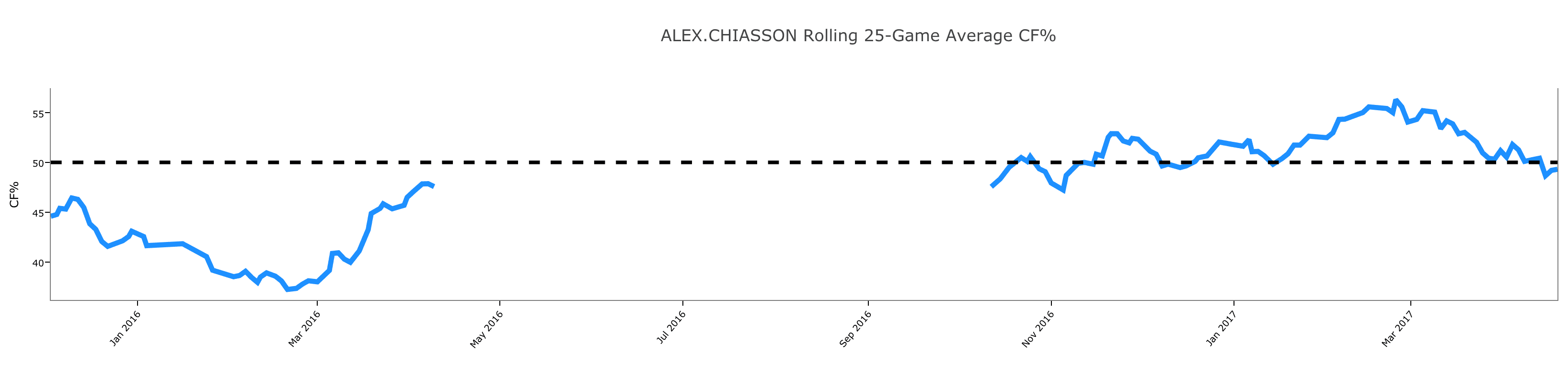 Chiasson rebounded points-wise, scoring an extra 10, all the while seeing about as much playing time. But where he really shone was his underlying numbers. Via Corsica: