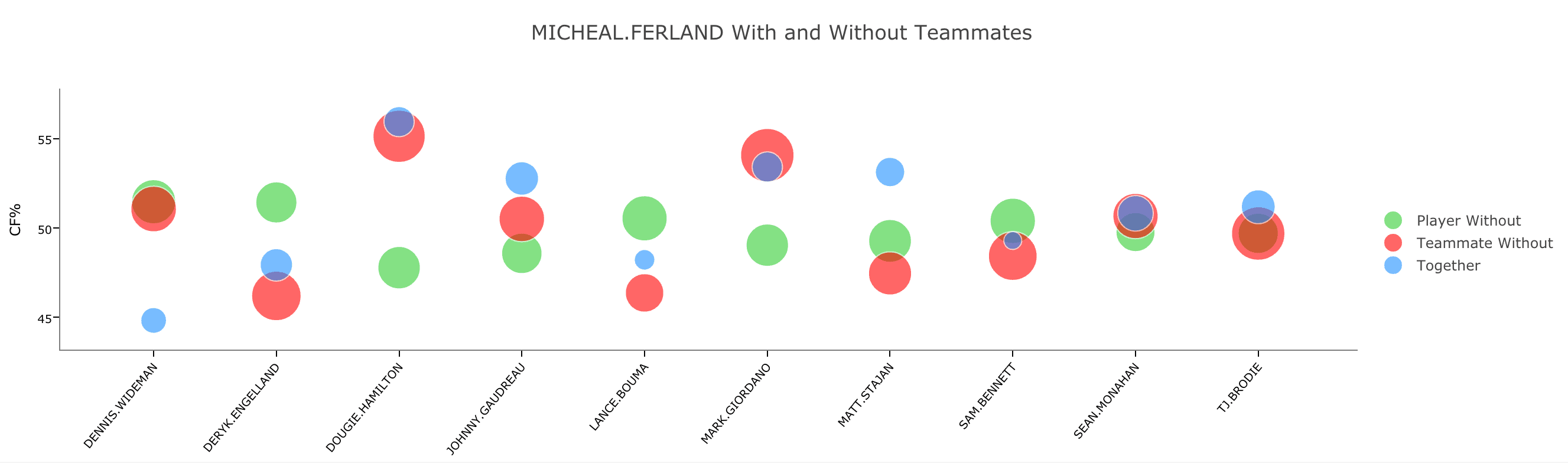 For the most part, Ferland appears to have a solid, if unspectacular, effect on his teammates. His presence helped Matt Stajan, Gaudreau, and T.J. Brodie to an extent, while he didn’t have too much of an effect on Monahan, and playing with Dougie Hamilton and Mark Giordano helped him more than he helped them.