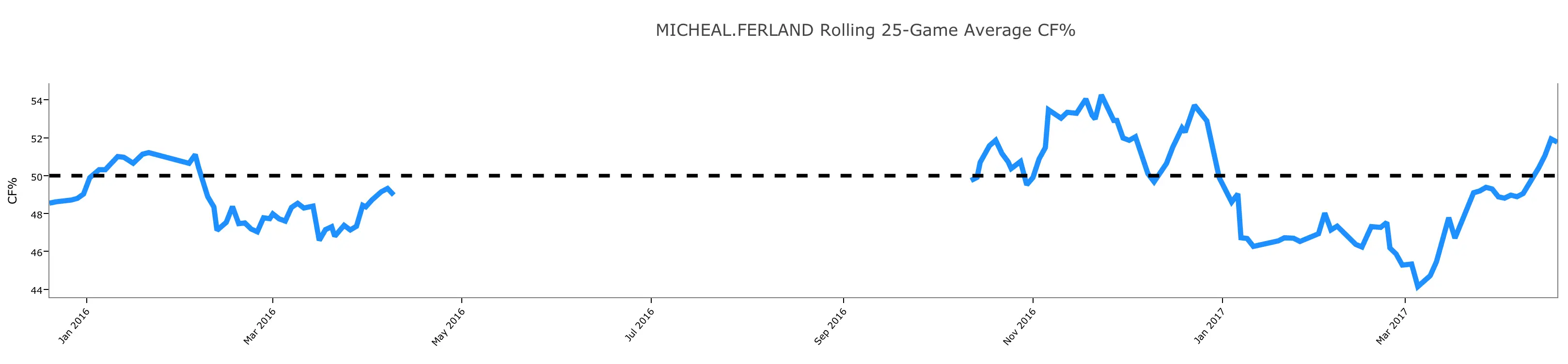 His overall 5v5 CF% of the season clocked in at 49.53%, up a bit from the 48.68% he held in 2015-16. Not everyone on a team is going to be above 50%, but Ferland toeing that line is a good sign. His corsi for this past season seems to have dropped about when the Flames’ as a whole went up in January, which is a bit of a bizarre inverse, but even then he still worked himself back up into positive territory as the year ended.