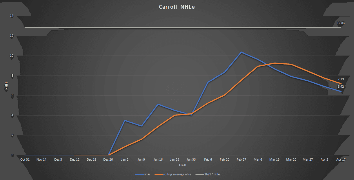 That chart pretty much tells you all you need to know if the numbers didn’t already. Of course it’s hard to score from the fourth line and the press box, but that was Carroll’s role in 2016-17 and he had twice the production. That’s not great for a player who was taken partially because of his year-to-year improvements in the WHL. No one was expected 40 points, but to be held to single digits over 42 games is very concerning.