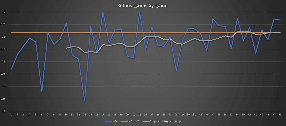 If it’s faulty to ascribe Gillies’ struggles solely to the lacking defence, it’s also faulty to chalk up his success solely to the arrival of one player. Valimaki is very good, but he simply isn’t able to turn a goalie from one of the worst goalies to an alright one that’s trending upwards, no one is. Credit where credit’s due, Gillies was a better player as the year went on and as he saw the net more often, although he had help from Valimaki (if it really is all because of Valimaki, we may not be appreciating him enough).