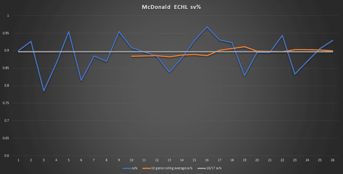 And that’s probably the only promising thing about McDonald’s season: he got hot for a few games. Throughout the year, he was one of the worst ECHL goalies among those that played 1,440 minutes (about 24 games, ECHL’s definition of qualified). He ranks next to last in save percentage despite an also next to last workload. He didn’t see that much action, but he didn’t really deserve that much more action.