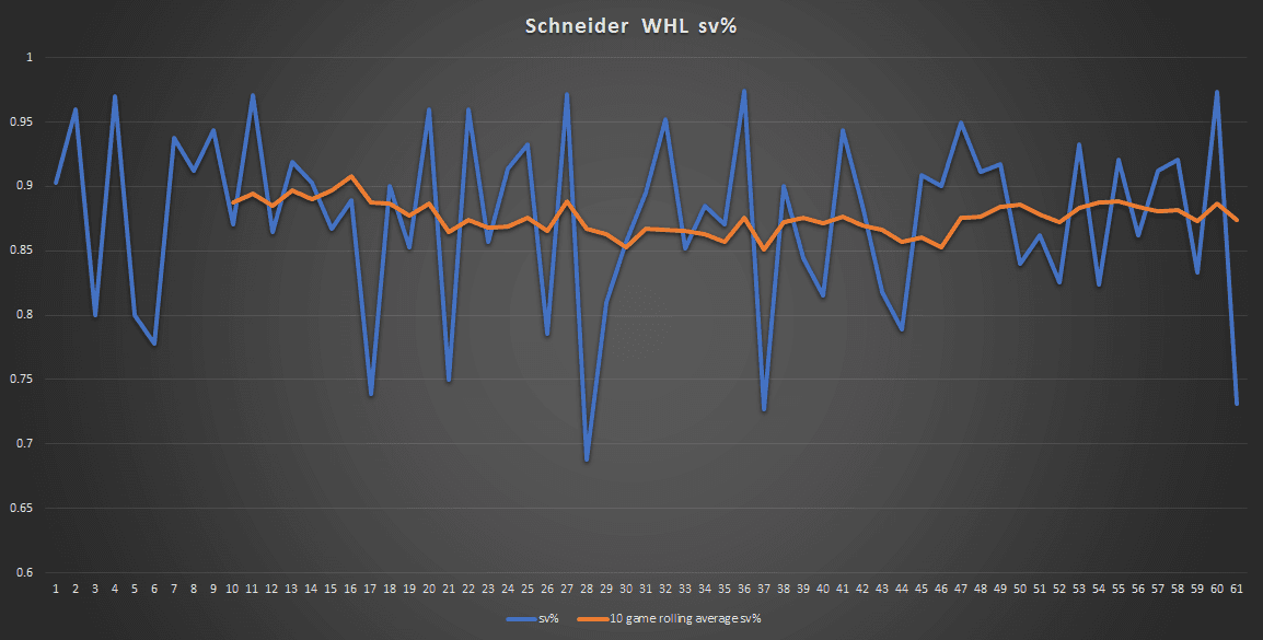 His 10-game rolling average SV% (i.e: a summation of how good he was in 10-game bursts) only creeped up above .900 once. Having a SV% of .900 is generally “stay away” territory for goalies at the CHL level. Getting over that hump once and then never getting close again is very, very concerning. Schneider was poor, and consistently poor. There’s really no other way to cut it.