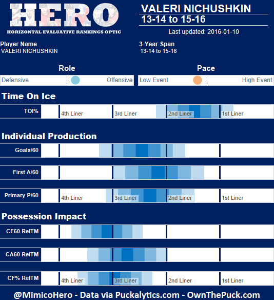 Nevertheless, Nichushkin’s underlying numbers are actually decent this year. He’s generating points at about a second liner rate given his ice time and his possession impact is middle of the road. That said, if we take his career as a whole so far he looks more like a third liner than anything else. Via Own the Puck: