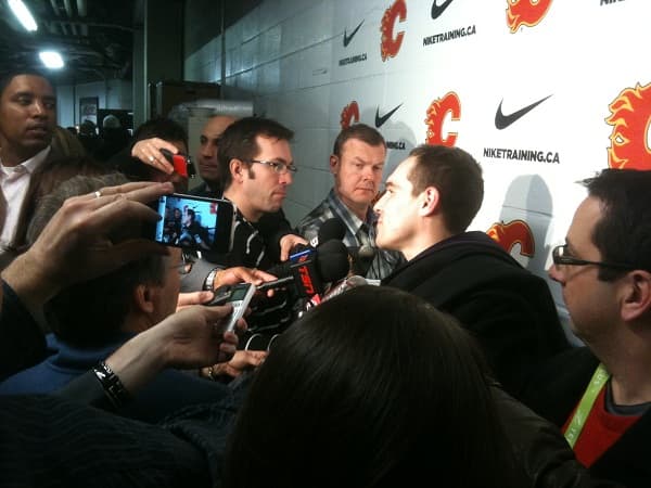 Cammalleri hasn’t played since January 28th when he suffered a shoulder injury in a game against the Buffalo Sabres, missing 12 straight games as a result. It’ll be a welcome addition to the Habs roster, as fans in Calgary still remember Cammalleri’s career season as a member of the Flames during the 2008-09 campaign. From what I got from being in his media scrum today (which you can see from above was rather large), he wasn’t missing this game for the world.