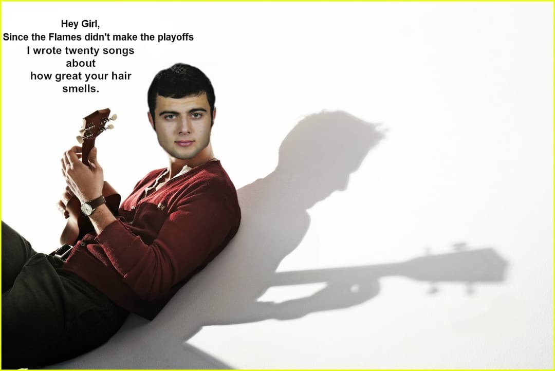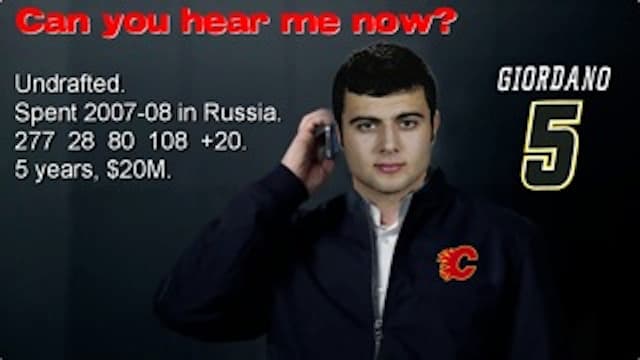 Sticking with the "movie superhero" theme, this entry manages to work in a few more Flames stars. Bonus points for casting Jay Bouwmeester as Trinity.