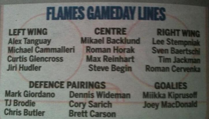 The Flames lineup is hard to determine tonight. Their official site has no mention of how things are shaping up, nor does their twitter feed. The ever helpful folks over at Coppernblue have published the lineup below which is quite a different squadron than suggested in the Edmonton Sun today. It’s almost as though the Flames themselves are running a smoke screen to mask how far the franchise has fallen.