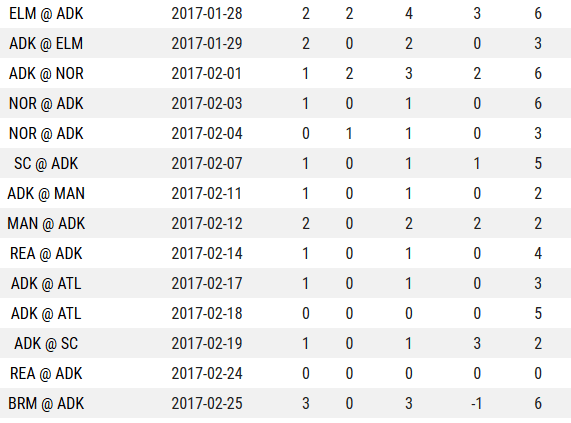 Let’s look deeper. Sixteen of those 21 goals came during a 14-game stretch. Here’s what that looked like (from the ECHL website):