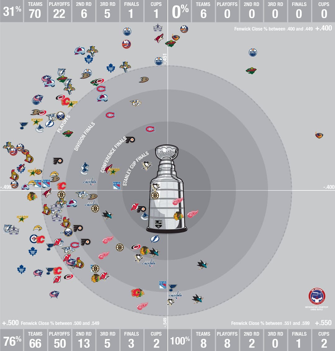 The rings of the graph represent each round of the Stanley Cup playoffs. The further the logo is away from the ring represents the distance from a playoff berth. I have also charted the percentage from .400 to .600. The further away from the .400 represents a stronger possession team. The ultimate on this index would be the 2008 Red Wings with a score of 59.39 located on the top portion of the Stanley Cup in the +.550 section. The 2008 Thrashers scrape the bottom of this index with a 41.23 and 28th position during the same season.