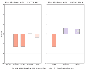 The best part of these isolated impact visuals is that we can see where the shots are coming from, not just different colour bars representing good or bad production in that specific area. Lindholm, per the viz, clearly loves to shoot from the right side of the ice, and he’s not getting much to the front of the net. And just as the Evolving Hockey suggests, the defensive side of the game hasn’t been anything more than average.
