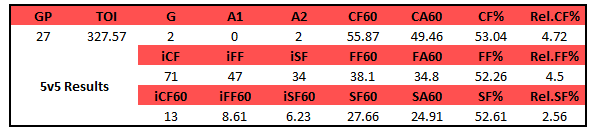 The major and obvious caveat here in this would be Nakladal’s sample size tracked in this project. Even though he has a limited sample, it’s still very promising and it validates a lot of Nakladal’s value and why he’s a guy this team needs. Nakladal’s tracked results at 5v5 prove he helps contribute to the team’s shot generation. When married with more modern metrics the picture is even clearer (via Corsica Hockey):