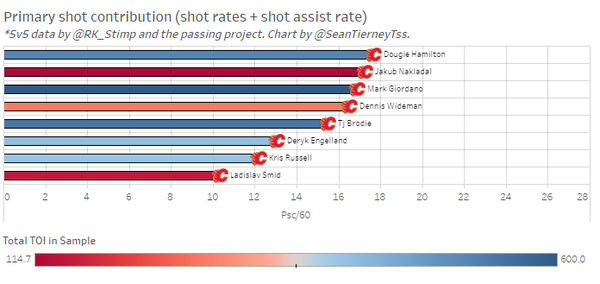 Using Sean Tierney‘s visualizations and Ryan Stimson‘s Passing Project data, when looking at primary shot contribution data (shots and shot assists) we see a rough concept of how each defenseman looked in terms of their PSC results.