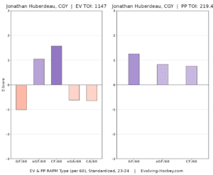 Analytically speaking, Huberdeau’s season wasn’t bad at all. Per Evolving-Hockey’s regularized adjusted plus-minus charts, his expected goals for per 60 (xGF/60), otherwise known as his rate of generating high-danger chances for himself and his teammates, was above average. The same can be said about his Corsi For per 60 (CF/60) — his ability to generate all shot attempts for him and his teammates.