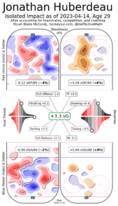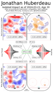 For some further analytical differences, let’s take a look at his isolated impacts from HockeyViz.