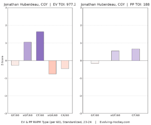 The main thing that I’ve taken away from these graphics is that the defence is about where it’s likely to be for the remainder of his career (and has been for his career prior to Calgary), but the offensive results he ended with last season were a direct result of his poor underlying numbers. This season, especially within the new year, the process has been much better, and even though he may not end with many more points than 2022-23, the foundation he is building within Huska’s system is much better for his future production outlook.