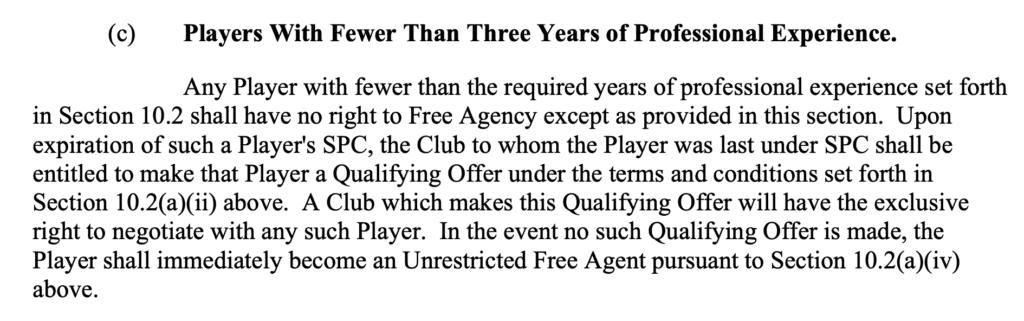 Similarly, Välimäki wasn’t a “regular” (Group 2) restricted free agent because he didn’t meet the pro years of service requirement (three) to be eligible to receive offer sheets – he was what we call a “section 10.6(c)” RFA, after the clause that specifies the free agency type.
