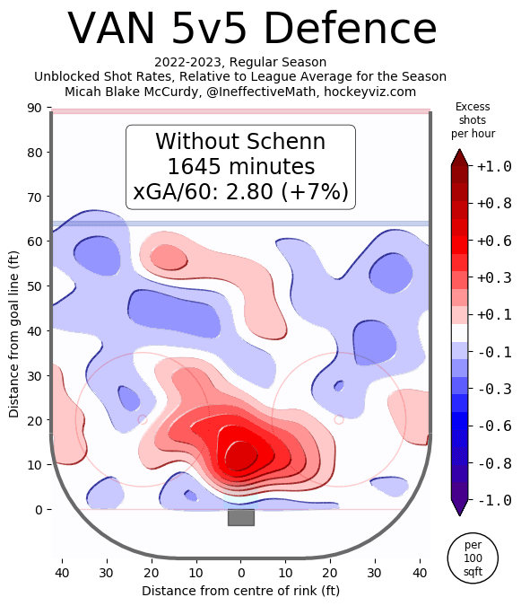 Hockeyviz.com has heatmaps that let us see how the team performs with a player on the ice and without a player on the ice. Let’s see how Vancouver is affected by Schenn.