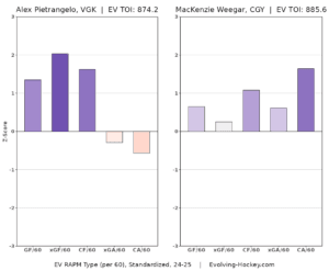 Weegar’s production (as seen in the regularized adjusted plus-minus chart below as well) on the offensive end of the ice is still above average, but only slightly. Pietrangelo has generated plenty of offence for the Golden Knights to work from — around two standard deviations worth — despite the similar point production to Weegar.