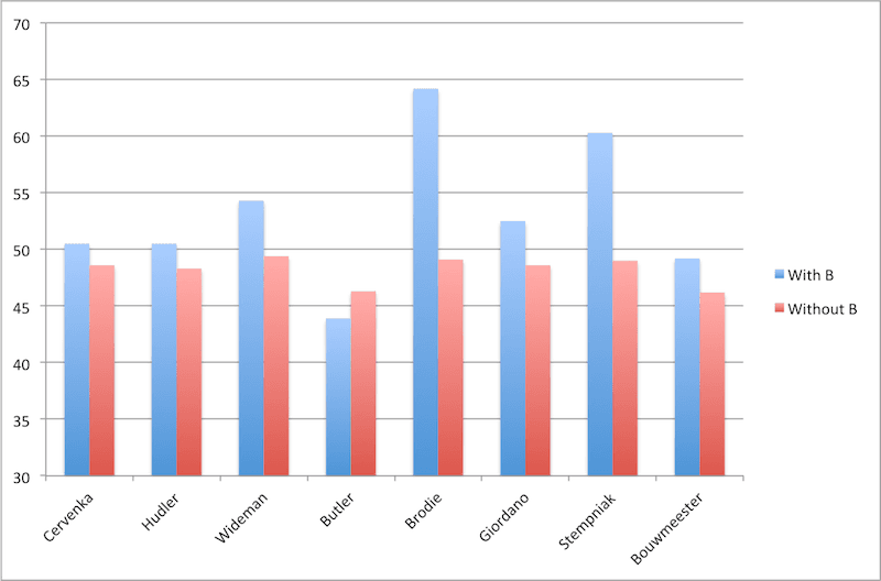 As you can see, everyone but Chris Butler (oddly) benefits from Backlund’s presence this season. Sometimes this can be explained by external factors (like if Hartley only started Backlund in the offensive zone), but considering his usage this season, the general positive effects are unlikely to be due to another variable like that.
