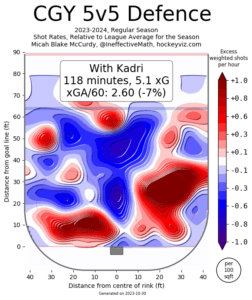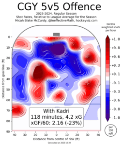 The Calgary defence when Kadri is on the ice per HockeyViz is actually above average, with most of the blue being within the slot here as well. However, the big pieces of red close to the net (specifically the one next to the net) are a bit worrying.