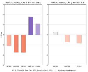 It’s hard to pinpoint precisely why the offence disappeared from him (even though the bar isn’t exceptionally high in the box score), and it may just be that Zadorov had a down year with all of the Covid-19 drama. It could also be related to his deployment. He was deployed in the defensive zone 61.6% of the time at even strength with the Blackhawks, 4.5% more than the next highest in 2015-16.