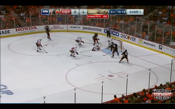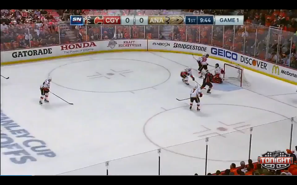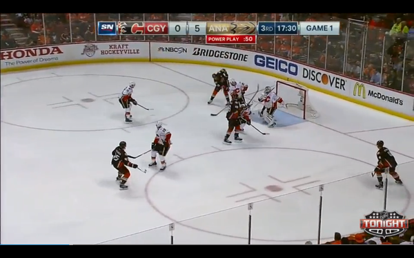 Six goals for the Ducks, six from within tight. Flames defenders were either caught watching, getting out-muscled, falling over, heading in the wrong direction for no apparent reason, or having the pucks go in off of them.