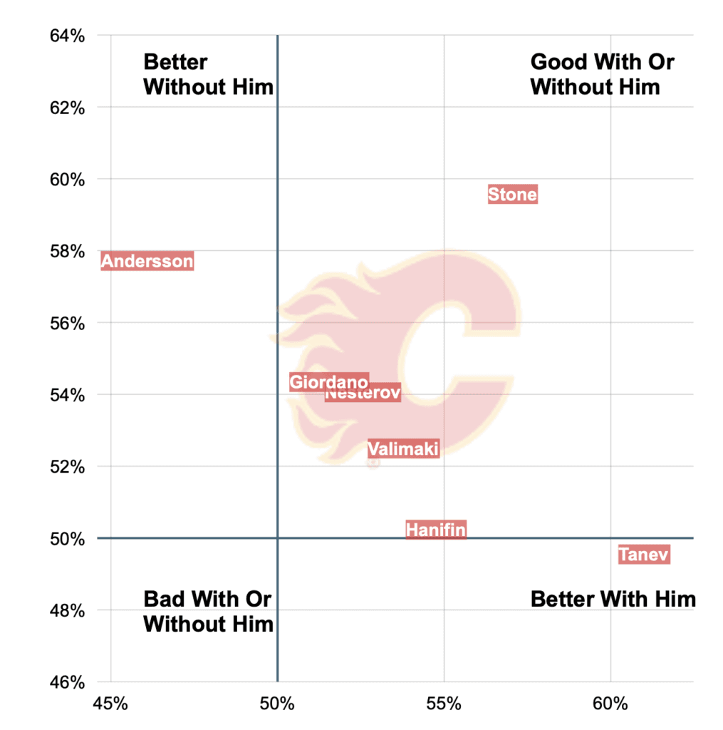 Not only did their tandem tower over most of the regular pairings in the league in these realms, but they were the most crucial chess pieces on the Flames’ board. The following graphic (courtesy of Moneypuck) compares the impact of every Flames defenceman’s presence and absence on the xG% fortunes of the team: