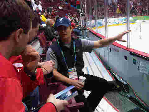 "That picture is of our main man Judd, an NBC cameraman shooting the Canada-Slovakia game last night. Judd was kind enough to let my friend sit in his seat at the glass to watch warm up which was awesome.