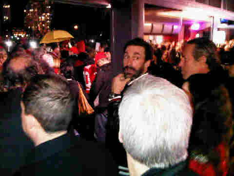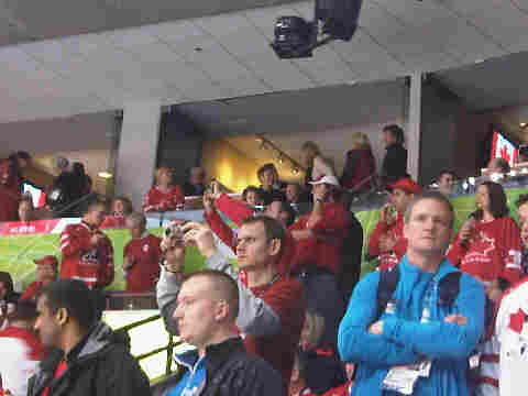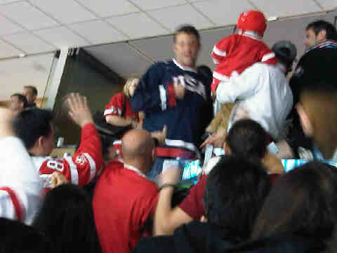 Up in the boxes above us was Mr. Vince Vaughn. It’s a little blurry but he is the guy in the USA jersey. Everyone was yelling at him that he was going down on Sunday and he was really mixing it up with the fans and having a blast. He must be eleven feet tall if he is an inch. I heard he later got smashed at Molson Hockey House and had to be helped out." (I heard this too – WG)