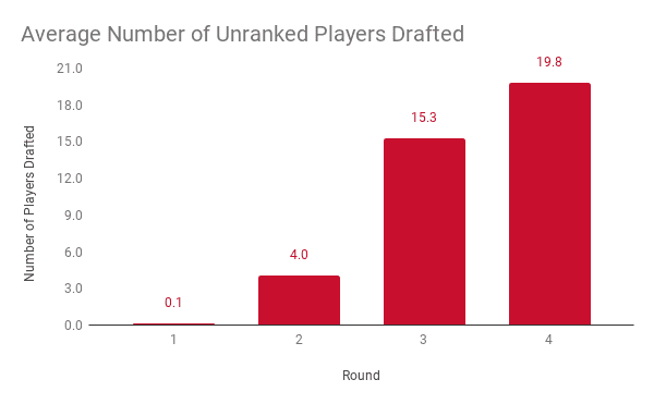 As expected, the willingness of GMs to “reach” for a prospect they like increases as the draft goes on. Over the past eight years, teams have mostly stuck to drafting top 100 ranked players in the first and second rounds, but after that, all bets are off. In fact, on average, over half the draft choices in the third round and later are from outside the top 100.