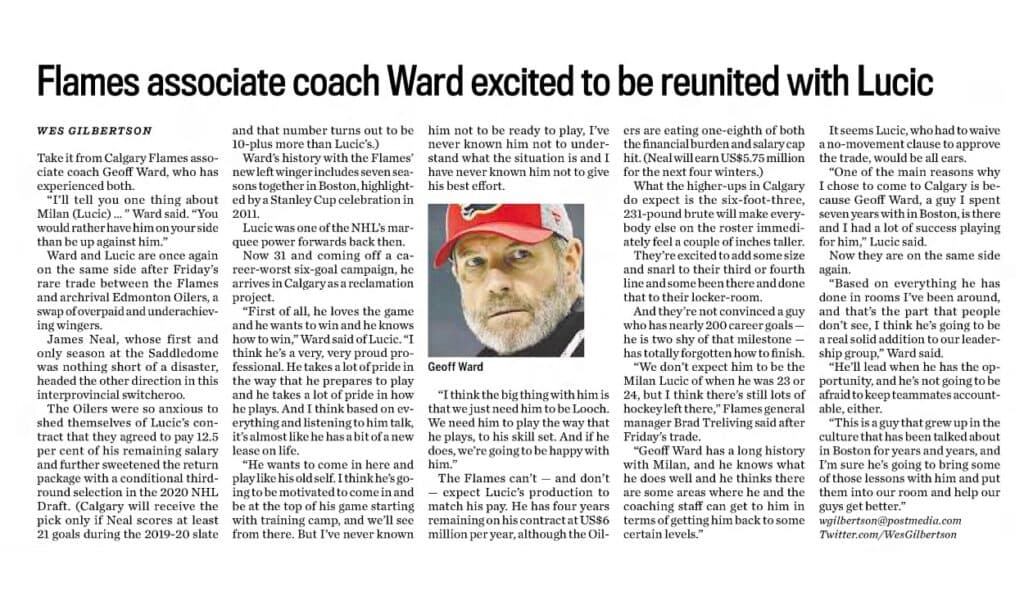 Article from the Calgary Herald in 2019 on Calgary Flames associate coach Geoff Ward speaking on his excitement with acquiring Milan Lucic.