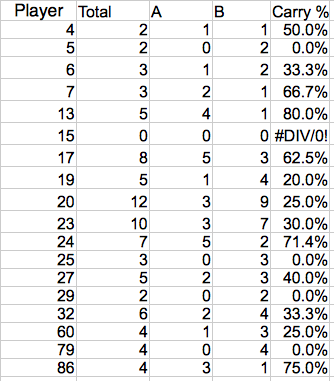 86 | JOORIS, JOSH | 13:18 | 5 | 3 | 01:02 | 0 | 0 | 00:25 | 0 | 1 |