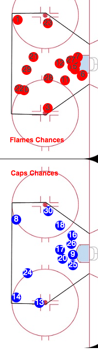 The Flames were less coordinated in general in the middle stanza: lots of missed passes and nice plays that just missed their mark. This resulted in quite a few turnovers, but they also showcased the back-checking abilities of a handful of players – notably Joe Colborne and T.J. Galiardi. There were also a few off-sides caused by the Flames bench opening inside the blueline – a stick-tap to Canadian Press’ Darren Haynes for noting that. Anyhoo, the Flames just couldn’t put much together, but the Caps weren’t that much better in the second. The Flames out-shot Washington 9-8 (miraculously), but the Capitals had the edge in Corsi events 20-12, face-offs 10-6 and scoring chances 5-3.