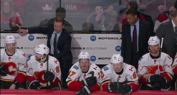 The Flames shuffled their lines around a lot in the third period to try to get something going. The most consistent lines were: Frolik-Backlund-Ferland, Gaudreau-Monahan-Versteeg, Tkachuk-Bennett-Brouwer, Bouma-Stajan-Chiasson. Defensive pairings didn’t really change around.