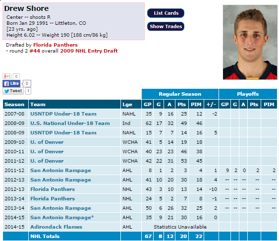 Firstly, as your probably know, the Flames made a trade today. Centre Corban Knight was traded back to the team he snubbed after his draft, these same Florida Panthers, in exchange for 6’3 200lb centre Drew Shore. I like the deal as Shore seems to be ahead of Knight in terms of production. He also has had a much for extended look in the NHL (67 games) and can play RW as well. Flames take advantage of Florida’s logjam at centre (Barkov was a scratch tonight fyi) and trade one decent player for a better one. High fives BT. Here’s Shore’s numbers so far in his career from hockeydb.com (UPDATE: I SEE RYAN POSTED A WHOLE ARTICLE ABOUT THIS SO GO CHECK IT OUT)