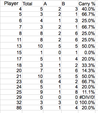 32 | BYRON, PAUL | 12:05 | 7 | 2 | 00:00 | 0 | 0 | 01:27 | 1 | 0 |