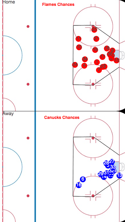 The Flames managed to right the ship long enough to mount a counter-attack in the final two minutes. After a Hudler shot from the top of the circle, a goal mouth scramble resulted in David Jones, Kevin Bieksa and the puck piling into the net. The goal was reviewed, but stood and Jones was awarded the goal.