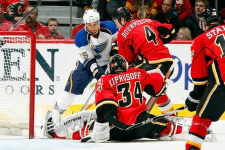 I’m sure most people expected the Flames to come out in the first period and go right after the Blues, but it didn’t quite happen that way. The Blues came out skating and as a result the Flames lapsed back into chase mode rather quickly. Most of the period didn’t warrant mention, a it was that uneventful. The Flames were lucky to get out of the period scoreless, being out-shot 8-7 and out chanced 5-3. Kiprusoff showed he was ready to play, making some nice saves to keep Calgary in the game.