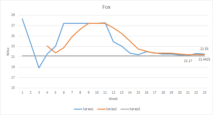 From the chart, we can see that Fox had some sort of minor WJC hangover, struggling to keep up with the astounding production he had at the start of the season. He was steady towards the end, but he certainly did suffer a bit.