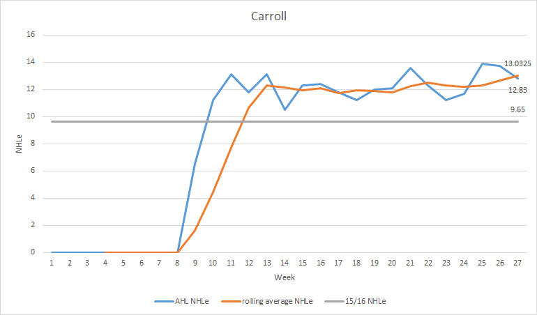 Carroll’s WHL time shows that he can be an effective, albeit low scoring, energy guy. In his AHL time, he’s mostly fulfilled that role. And he’ll likely play that role forever.