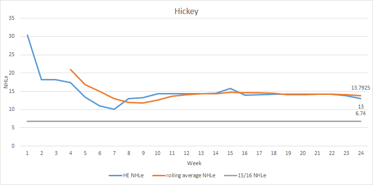 However, relative to his team, Hickey was still third in defensive scoring and third in defensive shooting. He wasn’t even lagging behind significantly, only nine shots away from first place (three fewer games played). If he got a bit more ice time, he’d probably be a bit closer to Chad Krys and Charlie McAvoy.