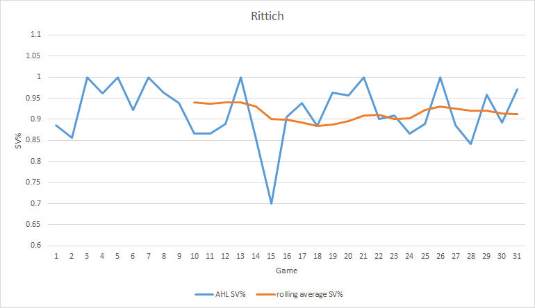 He’s so calm. He’s never out of position and he’s extremely athletic. While Jon can steal the show with a show stopping save, Rittich always seemed to not need to make an incredible save because he was always in the right spot. Positionally sound goaltender for sure. The thing that strikes me was his rebound control. I think the two things you need to be an NHL goaltender is the ability to control where the puck goes and to be able to perform at the same level every game. You knew Rittich was going to give you his all each time he started as I could count on probably one finger a game where he was subpar in. Other then that outlier, he was pretty consistent.