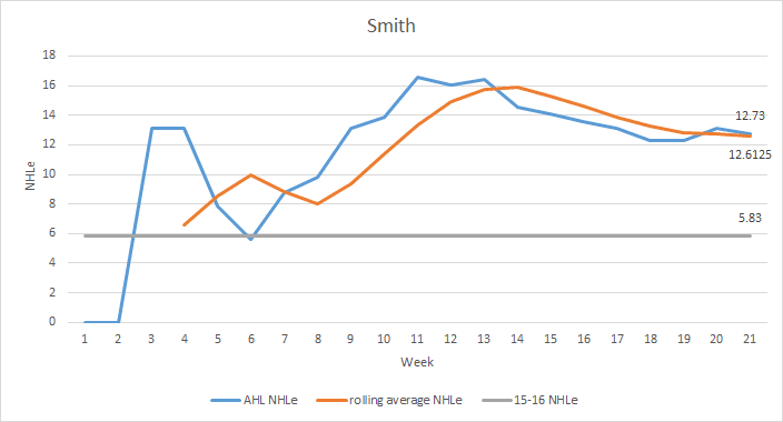 In his first AHL season, Smith contributed eight points in 54 games as a fourth liner.