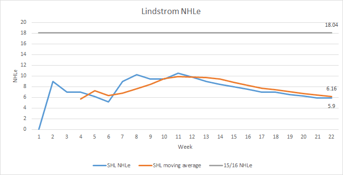 But we should contextualize Lindstrom’s performance. He was playing in a men’s league as an 18-year-old (turned 19 in January), and he played 50 games out of 52, the final two being at the end of the season. That’s pretty impressive.
