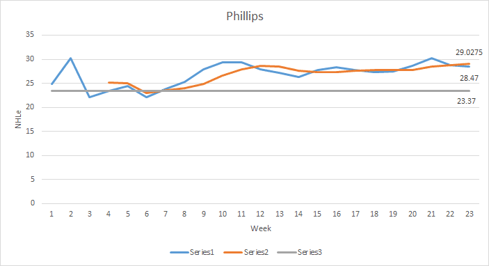 Throughout the season, he was consistent and he got better. Somehow, the chart still does not show how good Phillips was. 28.47 was his final NHLe, which is a meh number for someone in their D+1 year. However, if you only look at primary points, his NHLe would be 25.3.