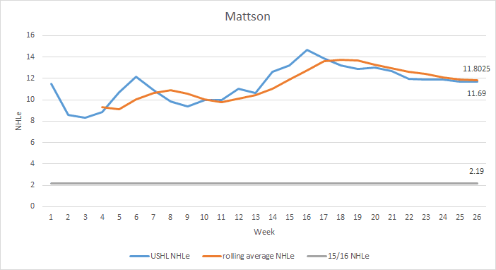 Mattson, while not being the best scorer for Bloomington, was still quite productive. He finished third on the team for primary points, 5v5 primary points, and scoring in general. Although the volume is a bit concerning, he did play on an offensively starved Thunder team that finished third worst in goals for and fifth worst in the same category at 5v5.